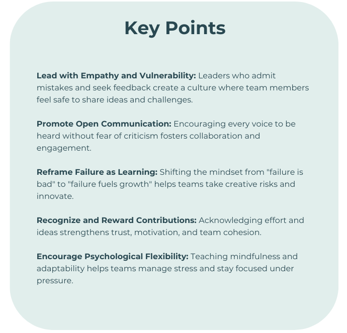 In today’s fast-paced, high-performance environments, psychological safety is the key to unlocking creativity, collaboration, and resilience. When team members feel safe to speak up, share ideas, and take risks without fear of judgment or punishment, they thrive. Research shows that teams with high psychological safety experience greater innovation, lower stress, and stronger performance (Edmondson, 1999).